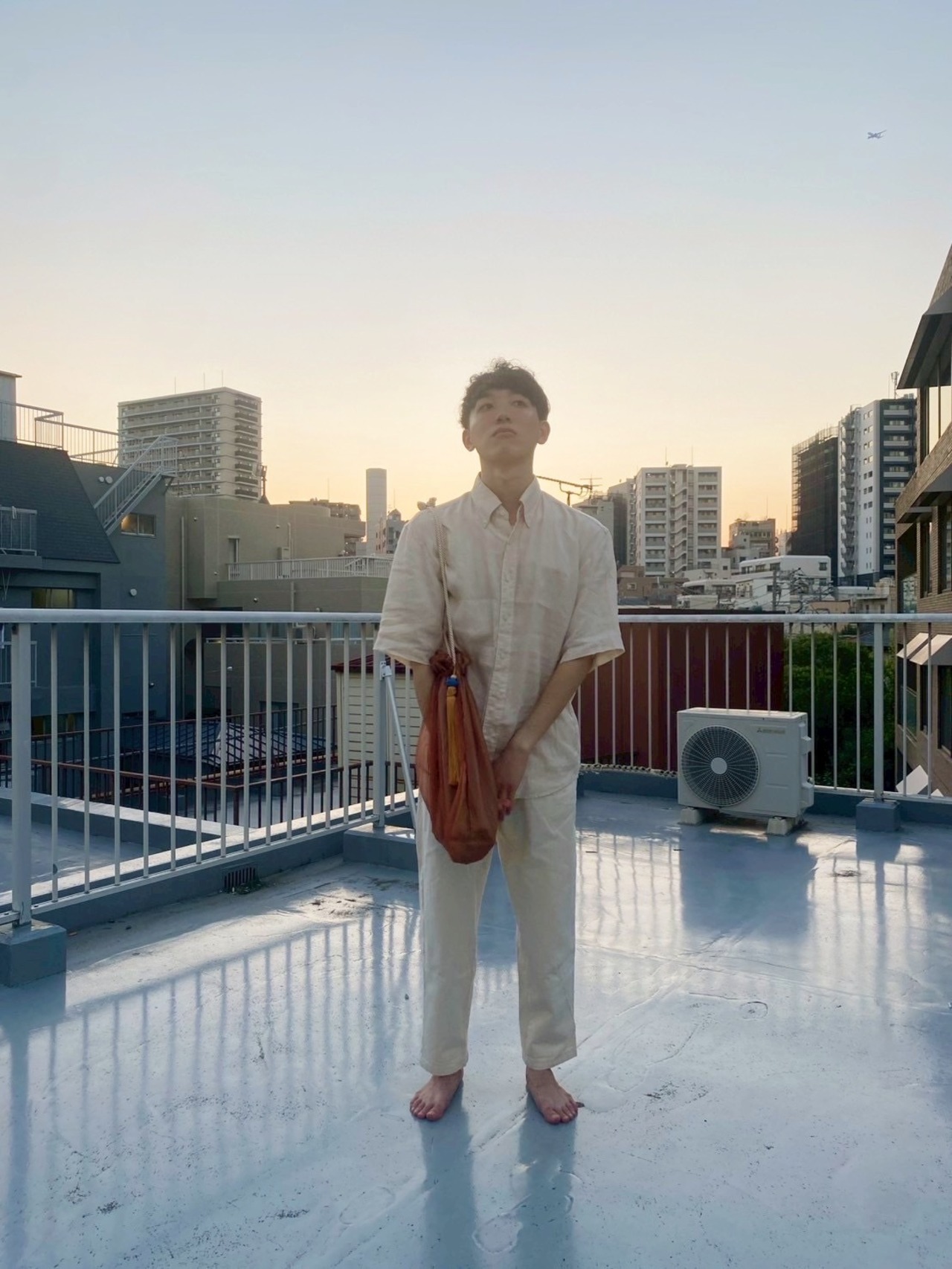 日没直後の薄暗い夕暮れ時をイメージして作りました。夕暮れ色のオーガンジーとサンドベージュ色の布を合わせたボリュームたっぷりのバックです。タッセルの色はorange・blueお選びいただけます。