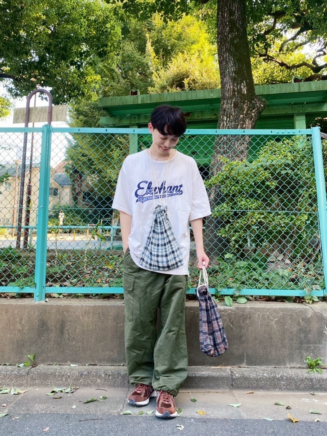 ワッシャー加工の生地を使用した温かみのある巾着バックです。あんまり巾着でチェックは見ないなと思って2色作りました。